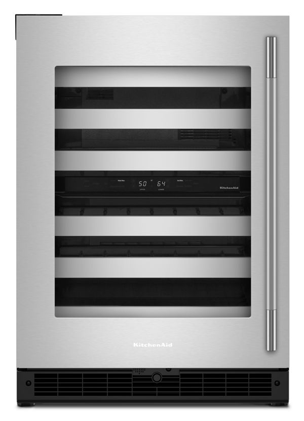 This 24" Undercounter Wine Cellar with Full-Extension Metal-Front Racks stores up to 46 standard Bordeaux-size bottles. Motion-Activated LED Lighting turns on as you approach, making it easy to see what’s inside. Fully Flush Installation with Hidden Hinges provides a built-in look within cabinetry.